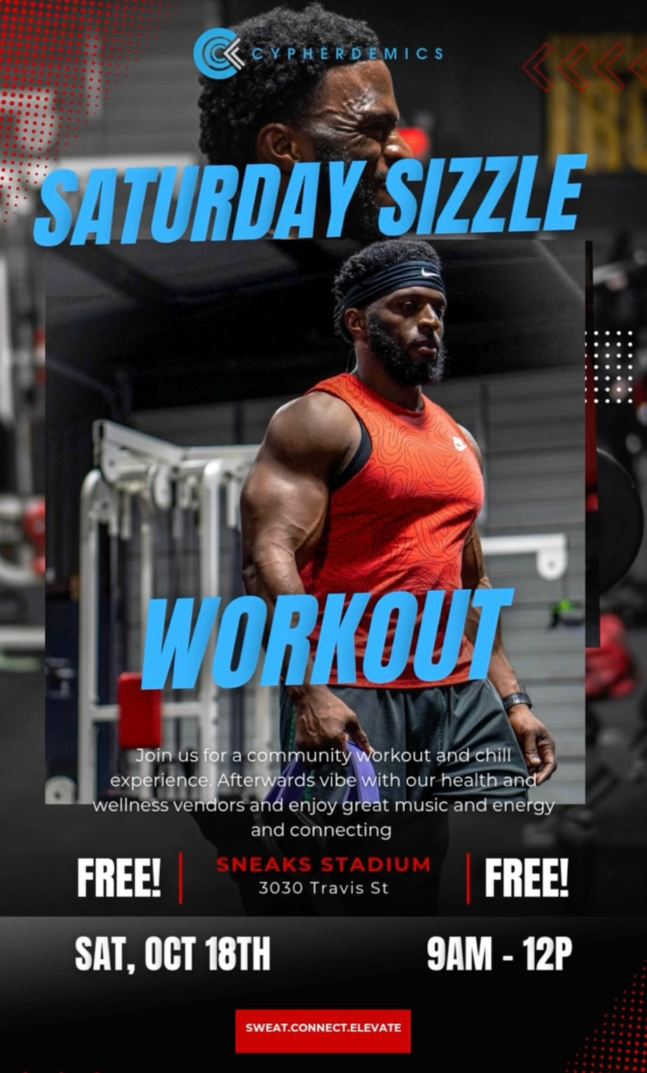 This Saturday, October 18th, from 9 AM to 12 PM at Sneaks Stadium (3030 Travis St) — join us for a community workout and chill experience.